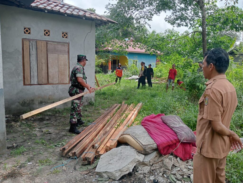 indopers.net | Palangka Raya (Kalteng) – Sebagai wujud nyata kepedulian terhadap kesulitan warga di wilayah binaannya,Sertu Eko Cahyono Babinsa Koramil 1016-01/Pahandut Kodim 1016/Palangka Raya pada Senin (15/09/2025) turun langsung gotong royong membantu perbaikan rumah milik ibu Salata yang beralamat di jalan Bangkirai RT 05 RW 02, Kelurahan Kereng Bangkirai , Kecamatan Sabangau kota Palangka Raya yang terkena musibah angin puting beliung beberapa waktu yang lalu.