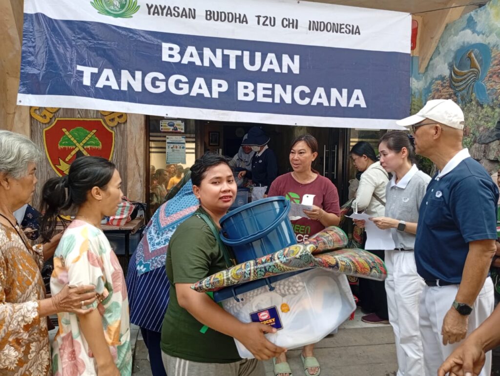 Setelah mengunjungi tenda darurat BPBD tempat warga mengungsi Lurah Penjaringan Makhrus Nugroho melanjutkan pemantauan ke posko utama penerimaan bantuan yang berada di kantor RW.010 yang mana sedang mengadakan pembagian paket sembako dari yayasan Buddha Tzu Chi Indonesia Berupa 1 box peralatan untuk mandi serta selimut dan makanan siap saji.