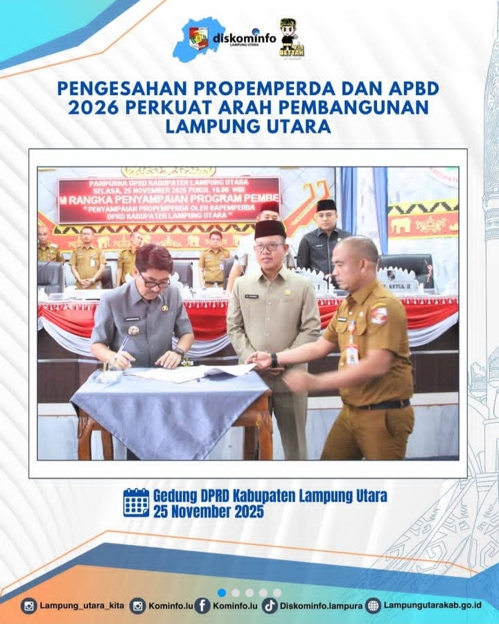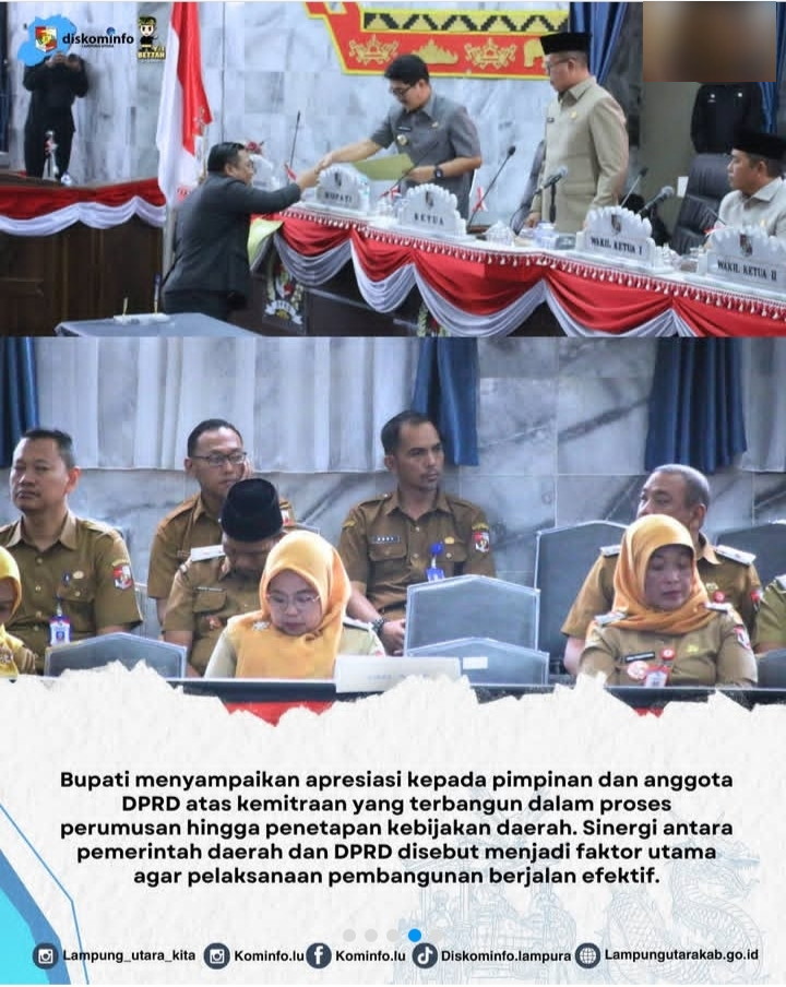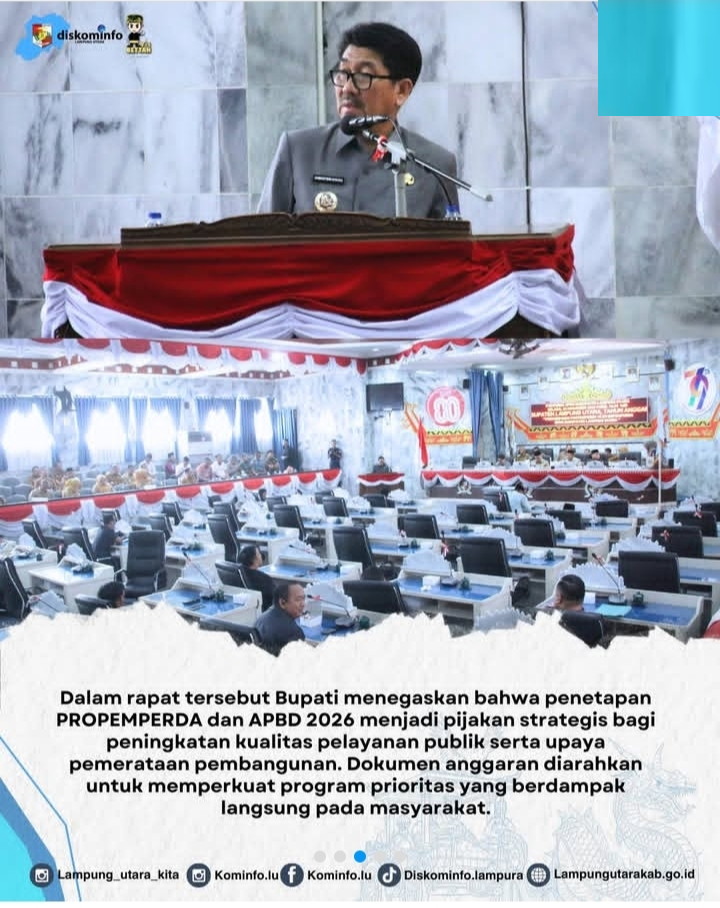 Dalam sambutannya, Bupati menegaskan bahwa penetapan PROPEMPERDA dan APBD 2026 menjadi pijakan strategis untuk mengakselerasi pembangunan daerah. Menurutnya, dokumen anggaran tahun mendatang telah diarahkan untuk memperkuat program-program prioritas yang memberikan dampak nyata bagi masyarakat, terutama pada sektor pelayanan publik dan pemerataan pembangunan di seluruh wilayah Lampung Utara.