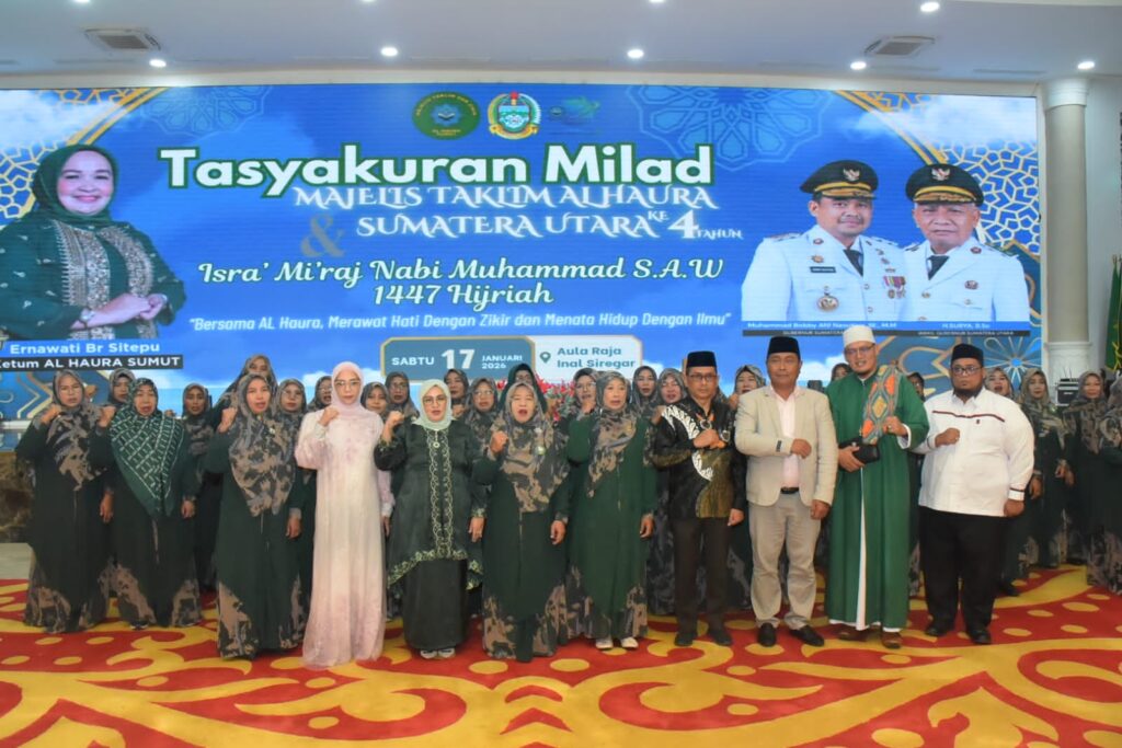 Kami tahu bagaimana perjuangan ibu-ibu Al Haura. Karena itu, kami ingin menegaskan, Pemerintah Kabupaten (Pemkab) Deli Serdang akan selalu bersama Al Haura,” tegas Wakil Bupati (Wabup) Deli Serdang, Lom Lom Suwondo SS, bersama Ketua I Bidang Pembinaan Karakter Keluarga TP PKK Deli Serdang, Ny Asniar Lom Lom Suwondo, pada Milad ke-IV Majelis Taklim dan Zikir Al Haura Sumatera Utara dan Peringatan Isra Mi’raj Nabi Muhammad SAW di Aula Raja Inal Siregar, Kantor Gubernur Sumatera Utara, Jalan Diponegoro, No.30, Medan, Sabtu (17/1/2026).