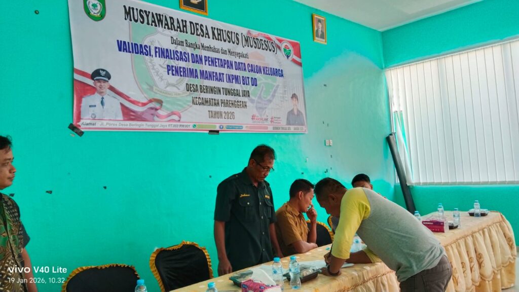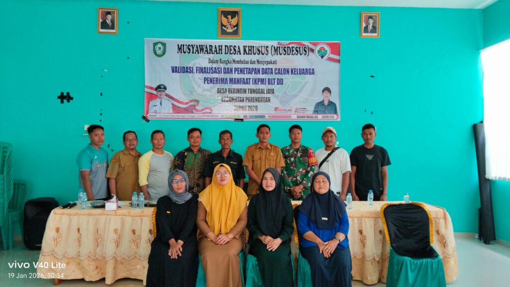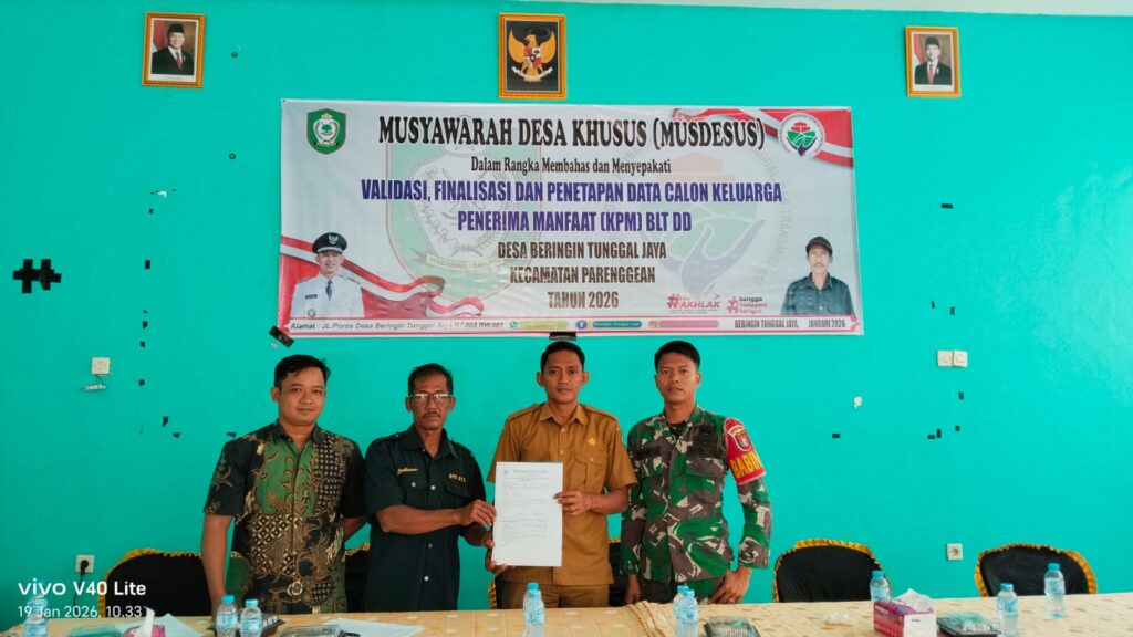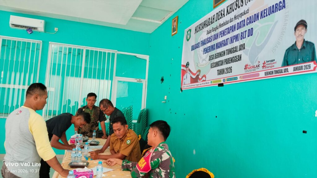 indopers.net | Kotawaringin Timur (Kalteng) – Babinsa Koramil 1015-07/Parenggean Pratu Ponidi menghadiri Musyawarah Desa (Musdes) penetapan Keluarga Penerima Manfaat (KPM) dan Bantuan Lansung Tunai Dana Desa (BLT-DD) untuk Triwulan I dan 2 TA. 2026, bertempat di Desa Beringin Tunggal Jaya, Kecamatan Parenggean Kab. Kotawaringin Timur, Senin (19/01/2026)