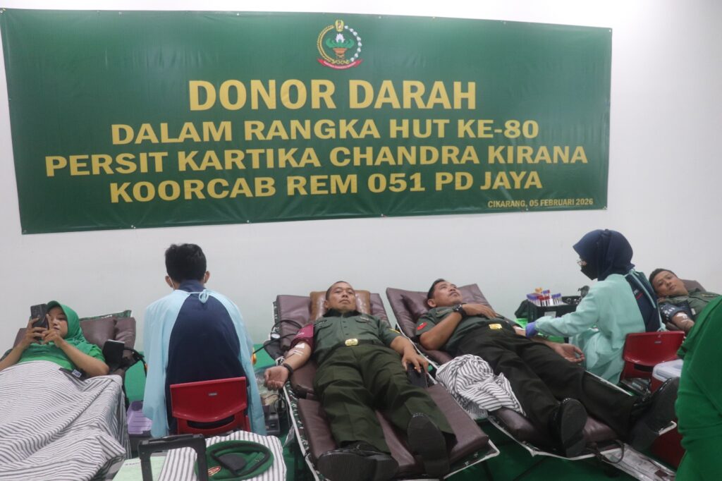 indopers.net | Cikarang (Jabar) – Persit Kartika Chandra Kirana Koorcab Rem 051 PD Jaya melaksanakan kegiatan Donor Darah dalam rangka Hari Ulang Tahun (HUT) ke-80 Persit Kartika Chandra Kirana. Kegiatan tersebut berlangsung di Aula Makorem 051/WKT, Jalan Niaga Raya Kav 1 Cikarang Kab. Bekasi, Kamis (5/2/2026).