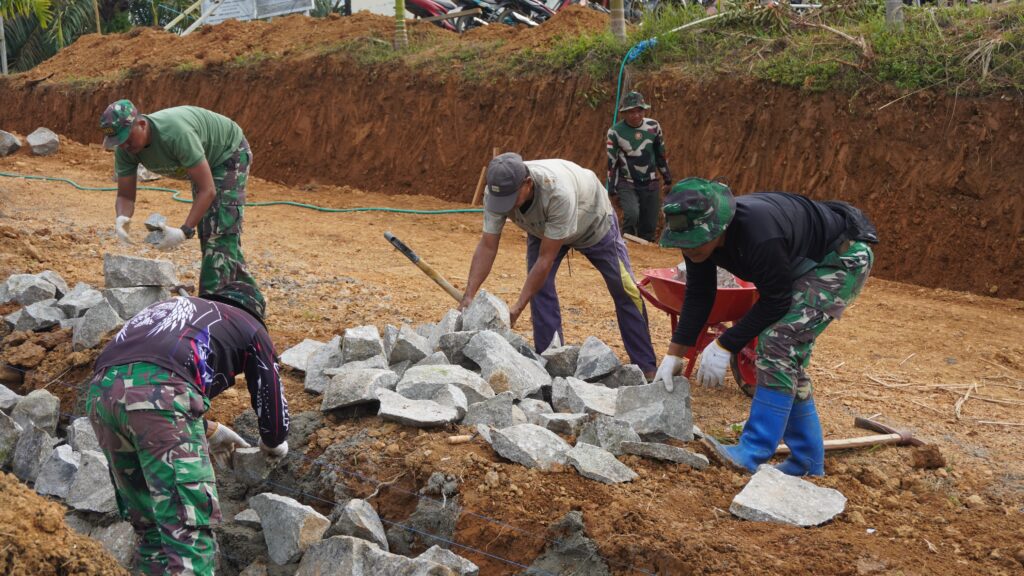“Satgas TMMD bersama warga melakukannya dengan cara memikul batu secara bergotong-royong, untuk membawanya ke tempat tukang yang memasang batu,” jelasnya.