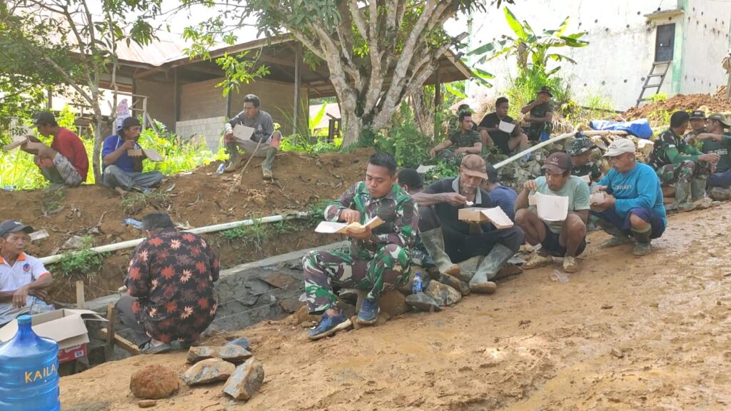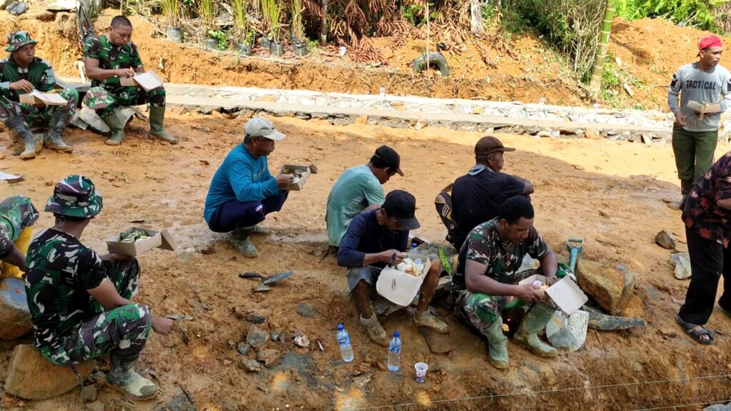 indopers.net | Kotawaringin Timur (Kalteng) – Menikmati makan siang bersama di lokasi TMMD Reguler Ke-127 Kodim 1015/Sampit memberi kesan tersendiri, dari pagi sampai siang mengerjakan target TMMD yaitu membangun siring badan jalan di desa Tri Buana Kecamatan Telaga Antang Kabupaten Kotawaringin Timur, saatnya istirahat makan siang untuk mengembalikan energi yang terkuras. Jumat (14/02/2026)