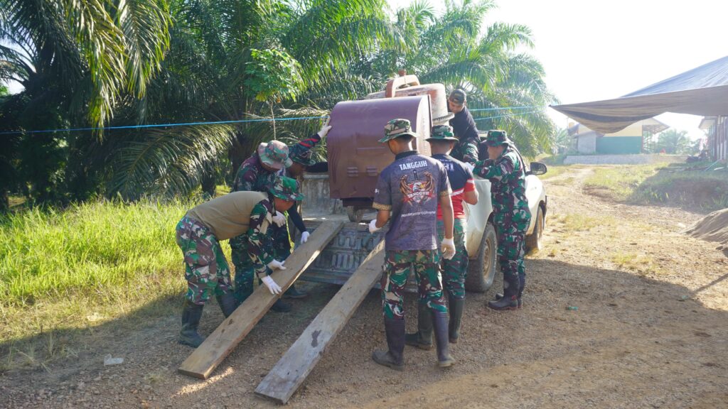 Satgas TMMD Reg Ke-127 Bekerjasama Untuk Memindahkan Mesin Molen