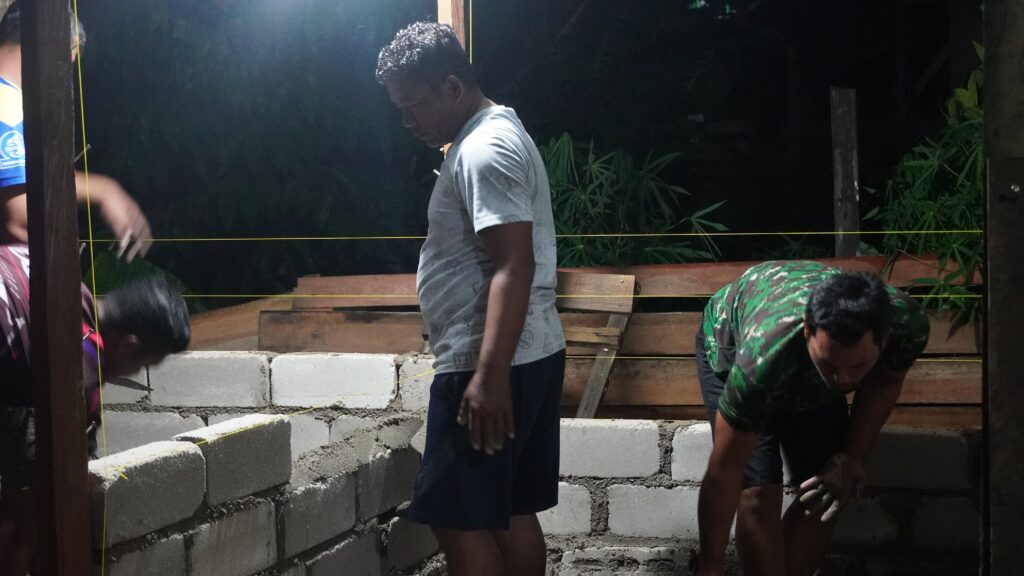Pengerjaan dimulai pengerjaan MCk dan tempat wudhu , keterbatasan waktu dan target penyelesaian sebelum akhir bulan mendorong pelaksanaan kerja bakti secara maraton. Warga dan Satgas TMMD Reguler ke-127 memanfaatkan penerangan tambahan agar pekerjaan tetap berlanjut saat malam hari.