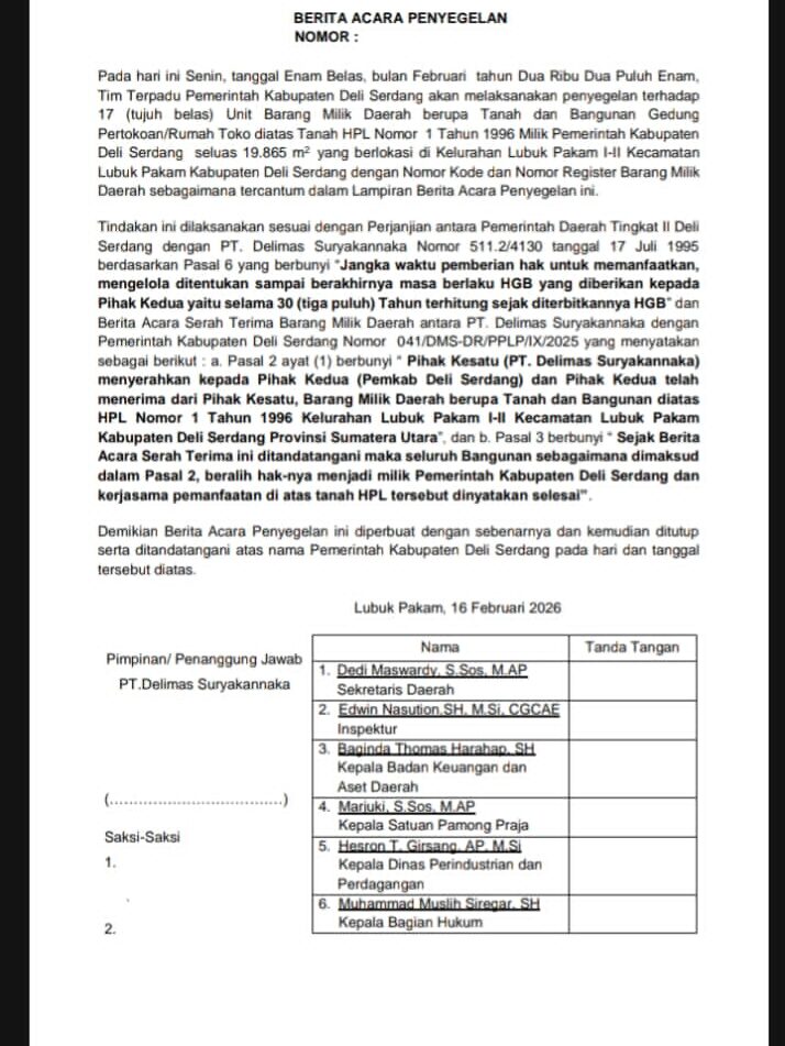 indopers.net l Deli Serdang [Sumut] – Tim terpadu Pemerintah (Pemkab) Deli Serdang Melakukan Penyegelan terhadap (17) unit Ruko barang milik daerah ( BMD) berupa tanah dan gedung pertokoan atau rumah toko diatas Tanah HPL No. 1 Tahun 1996 (ex. HGB) Milik Pemkab Deliserdang Dengan Luas 19.865 M2 yang berlokasi di Kelurahan Lubukpakam I-II Kecamatan Lubuk Pakam Kabupaten Deli Serdang Sumatera Utara. Senin,(26/02/2026) Sekira Pukul 09.00 Wib