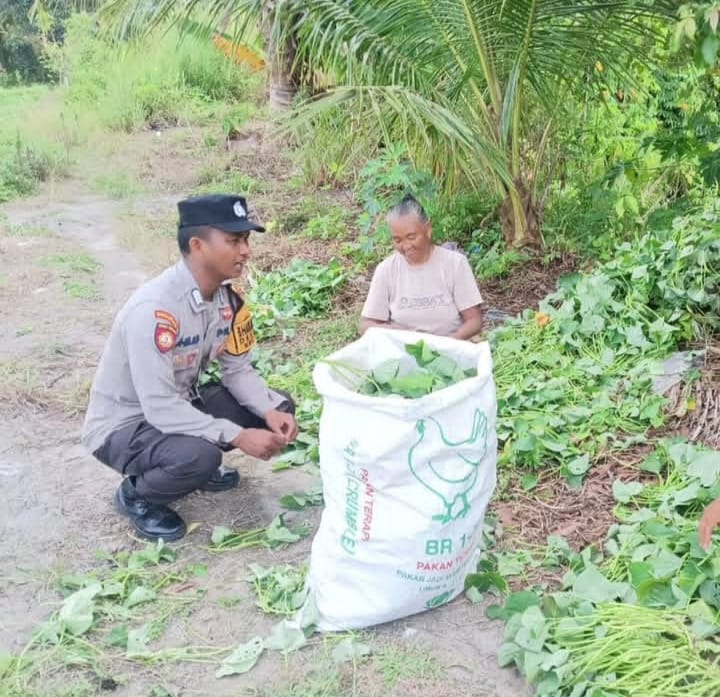 “Bripka Ahmad Yani, terlihat menyatu dengan alam dan masyarakat menyusuri Aria perkebunan yang dikelilingi tanaman hijau seperti singkong pisang.dan berbagai pohon tropis lainnya ia mendampingi ibu Sulastri, seorang petani setempat.yang sedang memanen Ubi yang tumbuh subur di lahan miliknya.