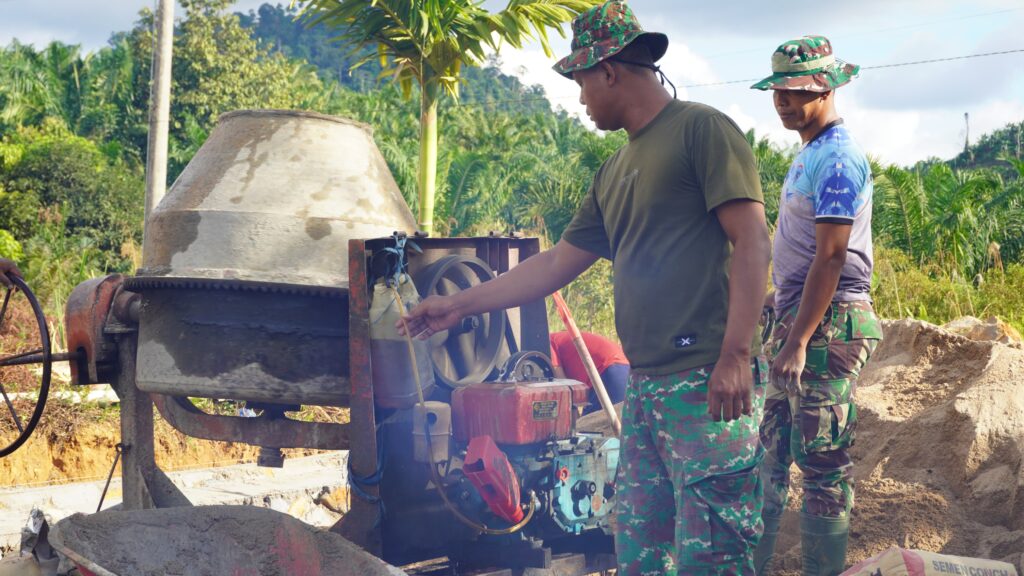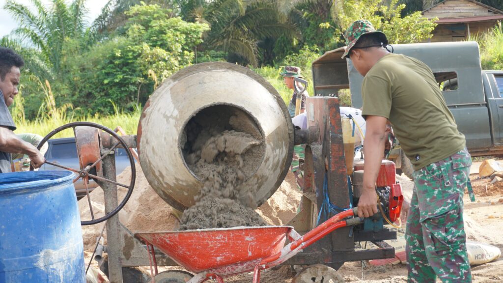 indopers.net | Kotawaringin Timur (Kalteng) – Kebisingan mesin molen pengaduk material pasir, batu dan semen seringkali menimbulkan suasana tidak nyaman bagi siapa saja yang mendengarnya. Namun, tidak menjadi soal bagi masyarakat dan para prajurit TNI yang tergabung dalam Satuan Tugas TNI Manunggal Membangun Desa (Satgas TMMD Ke-127 Kodim 1015/Sampit yang sedang bergulat mengejar target pengerjaan siring badan jalan di desa Tri Buana, Kecamatan Telaga Antang, Kabupaten Kotawaringin Timur. Jum’at (20/02/2026).