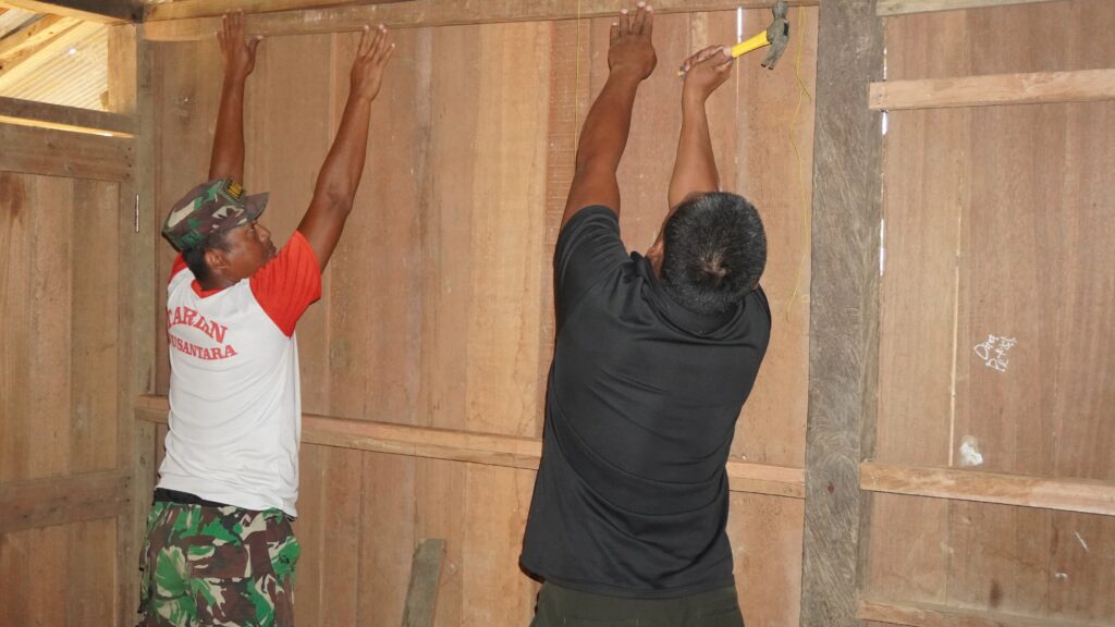Sejak pagi, anggota Satgas telah berada di lokasi sasaran fisik untuk melanjutkan pekerjaan, mulai dari pemasangan rangka atap, perapian dinding, hingga penyempurnaan struktur bangunan. Seluruh proses dilakukan secara gotong royong bersama masyarakat setempat.