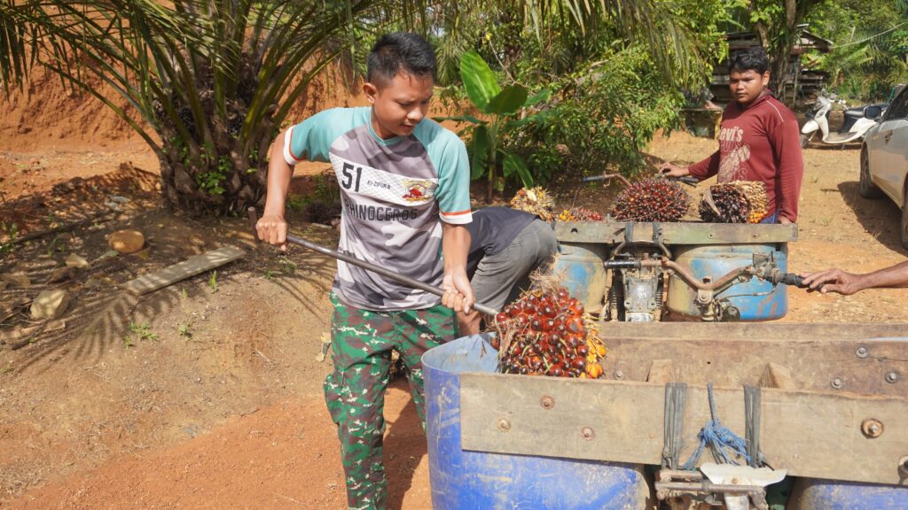 Anggota Satgas TMMD Reg Ke-127 kodim 1015/Sampit Bantu Warga Menaikan Hasil Kebun Kelapa Sawit