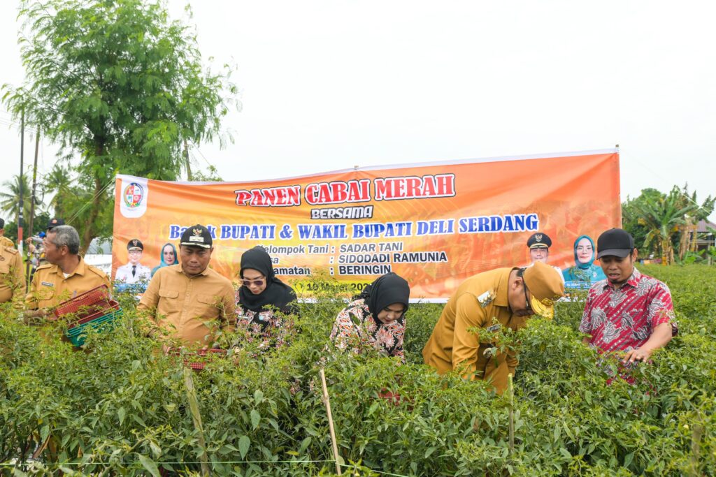 “Kami sebagai pemerintah daerah akan mengambil langsung cabai dari petani, kemudian kita jual ke pasar bebas. Selisih harga nantinya akan kita subsidikan,” ujar Bupati Deli Serdang, dr H Asri Ludin Tambunan yang turun langsung pada panen bawang merah bersama Kelompok Tani Oriza di Desa Sumberejo, Kecamatan Pagar Merbau, dan panen cabai bersama Kelompok Tani Sadar Tani di Desa Sidodadi Ramunia, Kecamatan Beringin bersama Wakil Bupati, Lom Lom Suwondo SS, Selasa (10/3/2026).