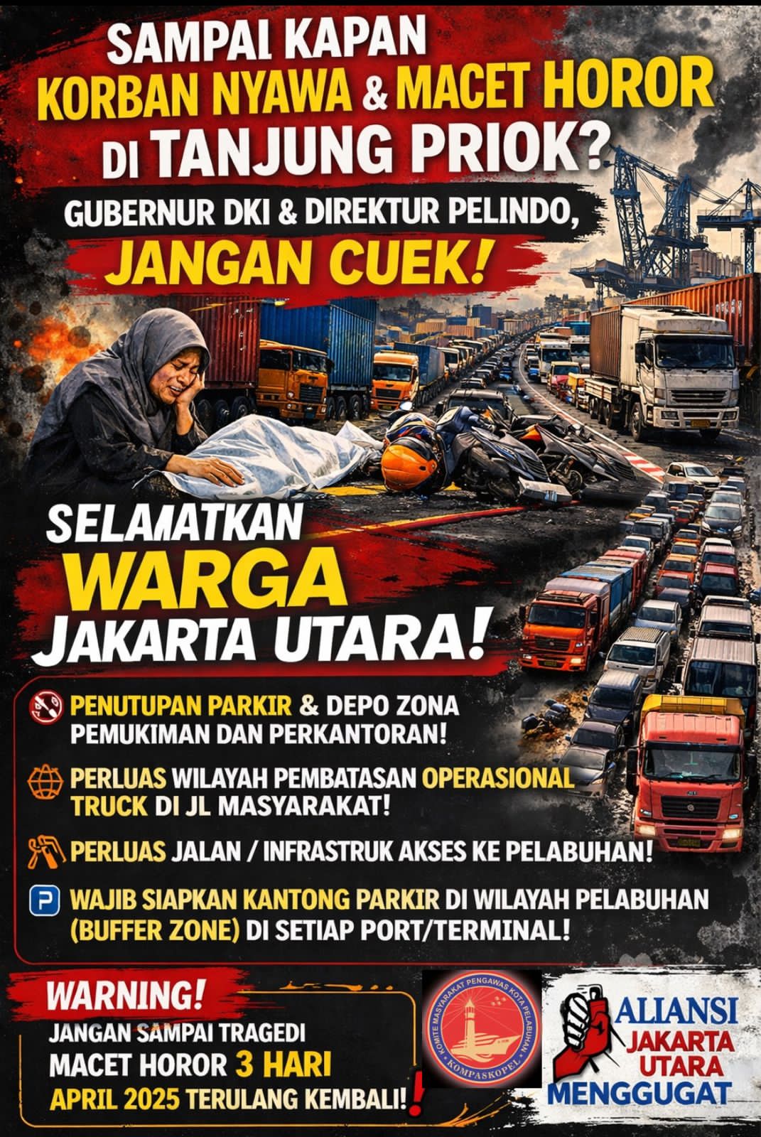 Masyarakat di kawasan Jakarta Utara mendesak Pemerintah Provinsi DKI Jakarta dan manajemen PT Pelabuhan Indonesia (Persero) untuk segera mengambil langkah konkret dan terukur. “Negara tidak boleh abai ketika keselamatan warganya terancam setiap hari di jalan-jalan sekitar kawasan pelabuhan. Jika tidak ada perbaikan serius, bukan tidak mungkin masyarakat akan menempuh langkah hukum sebagai bentuk tuntutan atas hak keselamatan di ruang publik. “Singgung Anung.