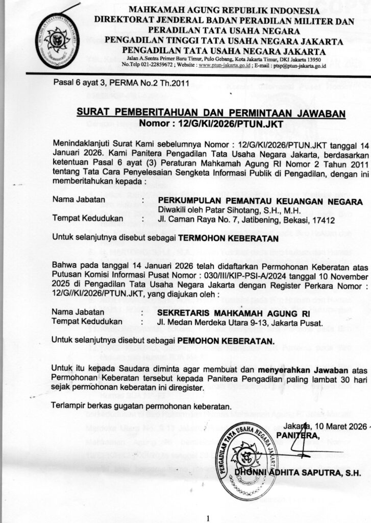 indopers.net | Jakarta – Mahkamah agung RI melalui Sekretaris Mahkamah agung (Penggugat ) mengugat Pemantau keuangan negara PKN yang di wakili Patar Sihotang SH MH sebagai Tergugat ke Pengadilan Tata Usaha negara PTUN Jakarta dengan Register Perkara Nomor 12/G/KI/2026/PTUN JKT , sebuah Paradigma Lembaga Tertinggi dalam penegakkan hukum di negeri ini lebih mengedepankan kekuasaan dan Otoritas dari pada menjalankan dan melaksanakan Undang Undang yang berlaku demikian disampaikan Patar sihotang SH MH ketum Pemantau keuangan negara PKN pada acara Konfrensi pers di Kantor PKN jl Caman Raya No 7 jatibening Bekasi pada dini hari Senin 16/03/2026.
