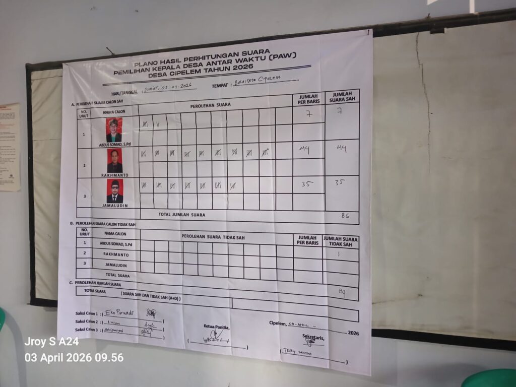 Dengan transparansi yang dijunjung tinggi, disaksikan langsung oleh para saksi dari ketiga calon dan warga yang tak sabar menanti, kebenaran pun akhirnya terungkap. Hasil akhir menunjukkan dengan jelas bahwa Rakhmanto, sang kandidat dengan nomor urut dua, berhasil memenangkan hati mayoritas warga Desa Cipelem, Dengan perolehan suara signifikan sebanyak 44 suara, Rakhmanto resmi diumumkan sebagai Kepala Desa Pengganti Antar Waktu (PAW) Cipelem. mengemban amanah suci ini untuk periode 2026 hingga 2030. Di sisi lain, Jamaludin, dengan semangat kompetisi yang patut diapresiasi, berhasil mengumpulkan 35 suara, sementara Abdul Somad meraih 7 suara. Seluruh 86 suara yang hadir telah berpartisipasi aktif dalam menorehkan masa depan desa ini.