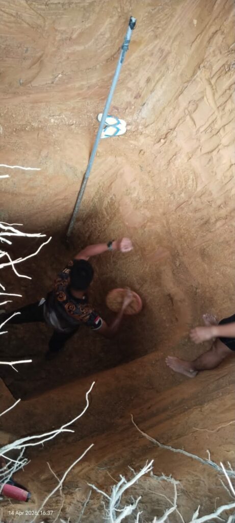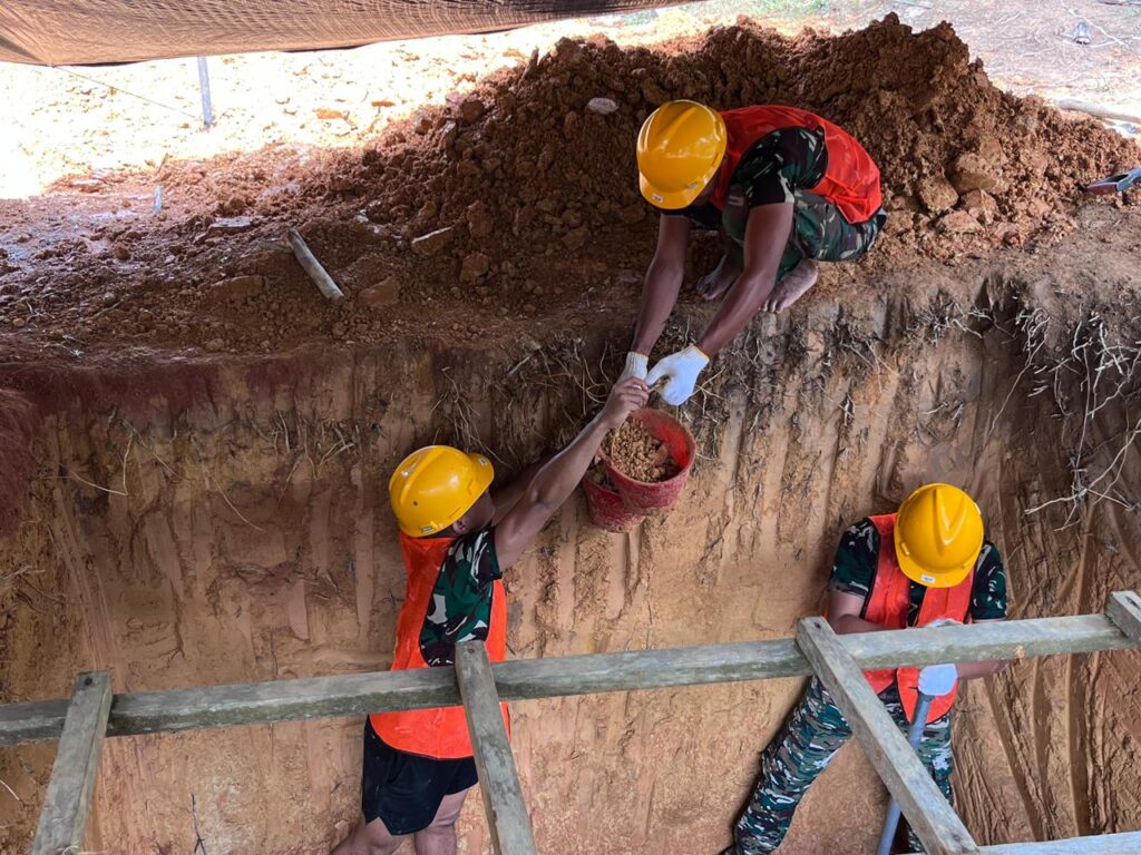 Secara bergotong royong, personel Kodim 1015/Sampit bahu-membahu menggunakan peralatan sederhana demi memastikan lubang cakar ayam dapat digali sesuai dengan standar yang telah direncanakan.