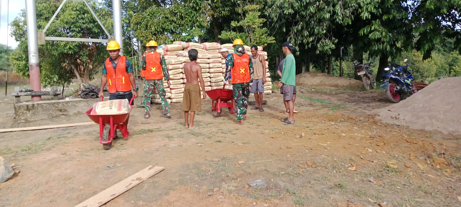 Kegiatan pergeseran semen dilaksanakan secara gotong royong,Semangat kebersamaan ini menjadi cerminan kuatnya sinergi antara TNI dan masyarakat dalam mendukung pembangunan di wilayah pedesaan.Tegas Babinsa 1015-07/Parenggean Serka Herman