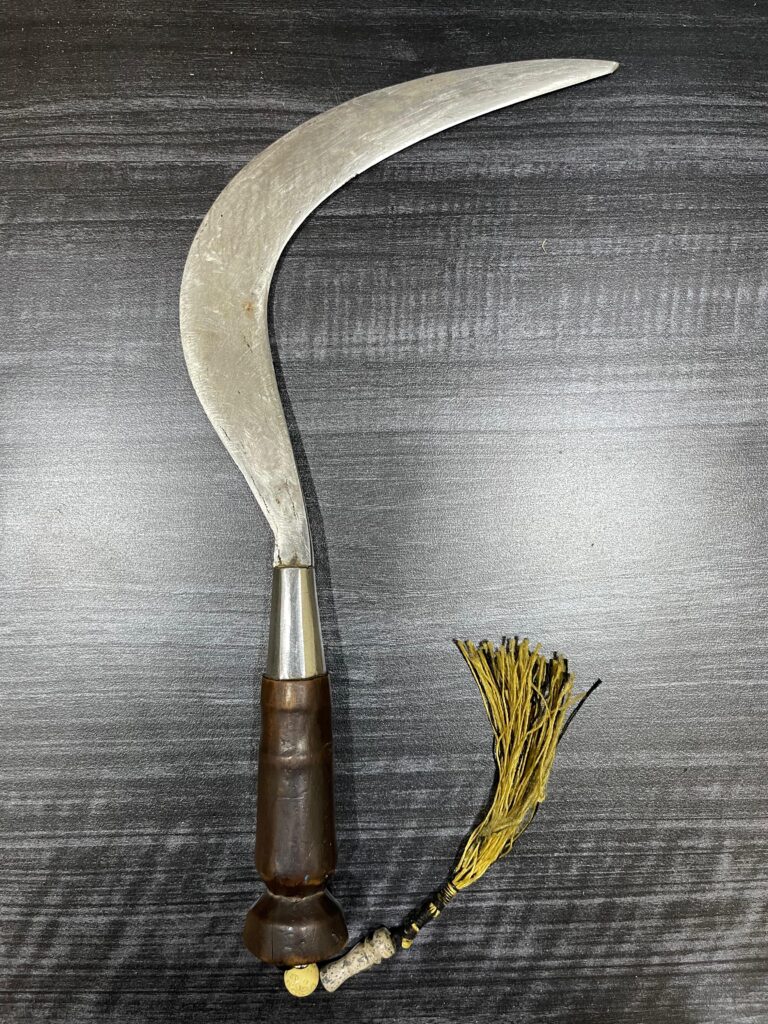 Saat dilakukan pemeriksaan mendalam oleh petugas di lokasi, ditemukan satu bilah senjata tajam jenis celurit sepanjang kurang lebih 30 cm yang disimpan di dalam bagasi motor. Barang bukti tersebut memiliki gagang kayu berwarna coklat tua dengan lilitan tali berwarna hitam dan emas.