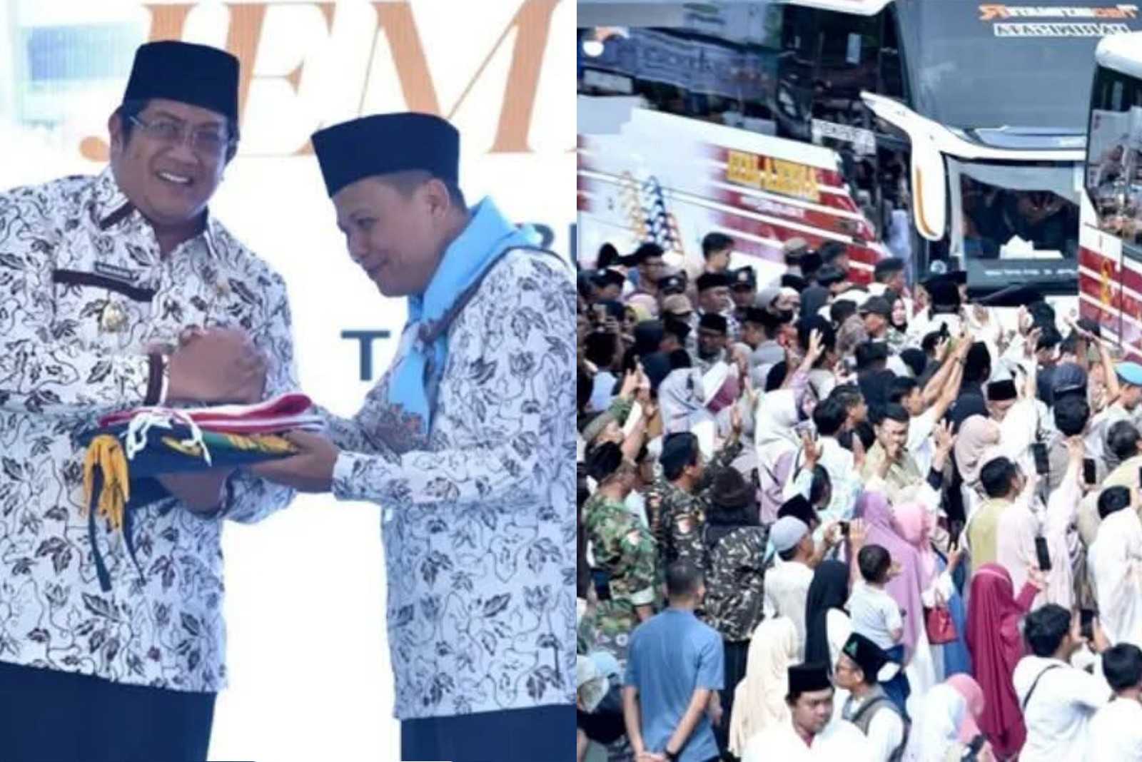 Wakil Bupati Pacitan, Gagarin Sumrambah, secara resmi memberangkatkan rombongan yang menggunakan enam armada bus dari halaman Pendopo Kabupaten menuju Asrama Haji Embarkasi Surabaya, Senin (27/4/2026), untuk menunaikan rukun Islam kelima.